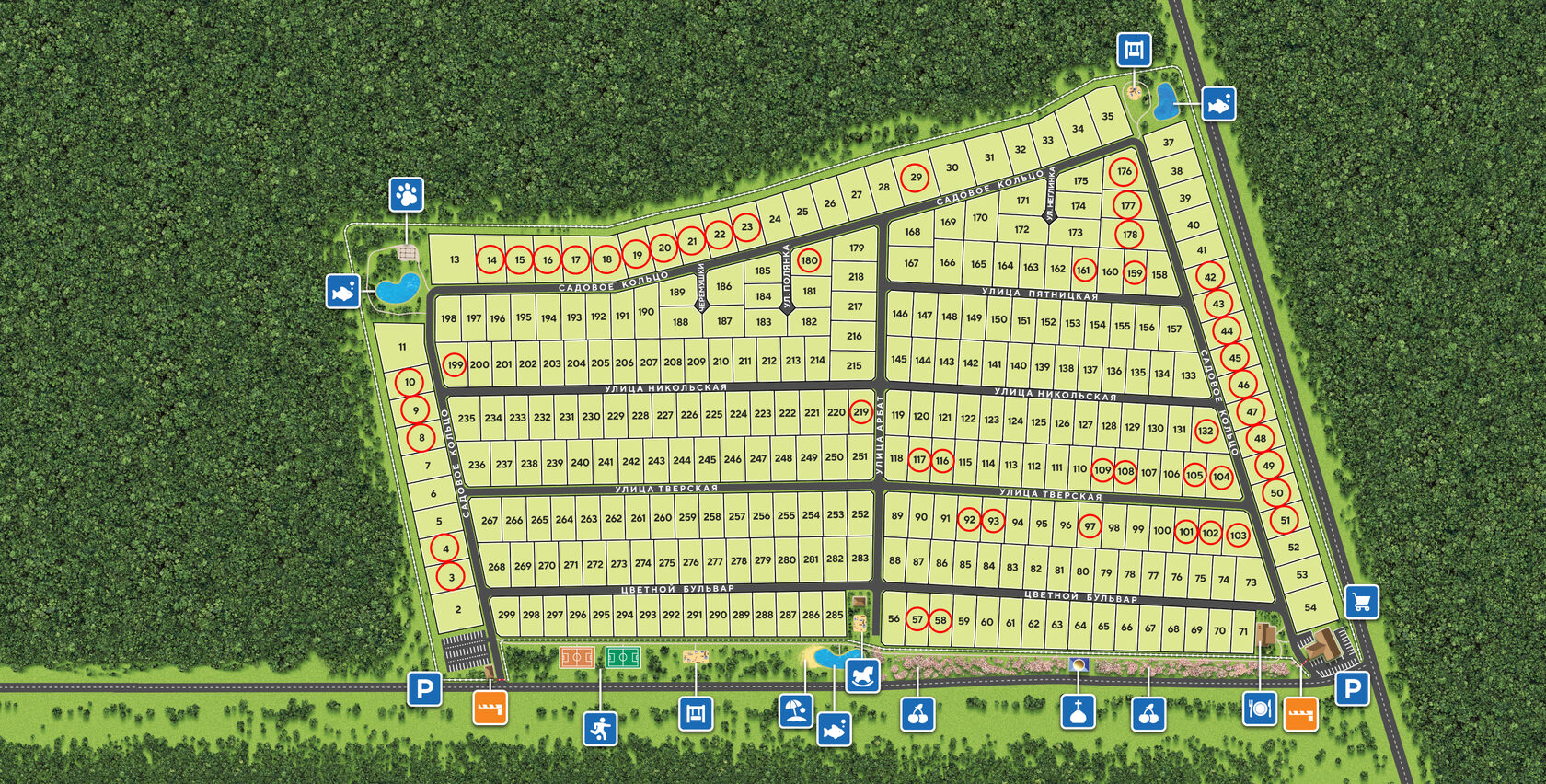 Двигайте карту, чтобы увидеть в окне все участки. При нажатии на поле участка появляется его цена и размер. Участки зеленого цвета сейчас в продаже.